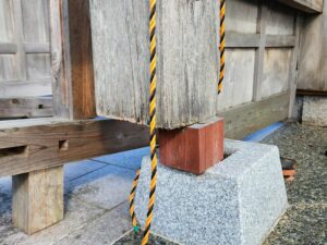 しかし、これ単純に水平を直すのではなくて参道そのものが70cmくらい下がっているんで、そこも直さないといけませんから、水平に戻してから一旦1m程持ち揚げてから礎石に据え付け直しとなります。